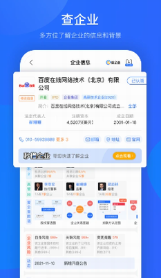 企业高管、明星老板可以快速查询企业信息;对人事任命、投资公司和合作伙伴有深入的了解。
